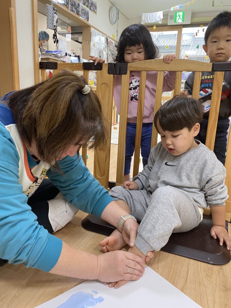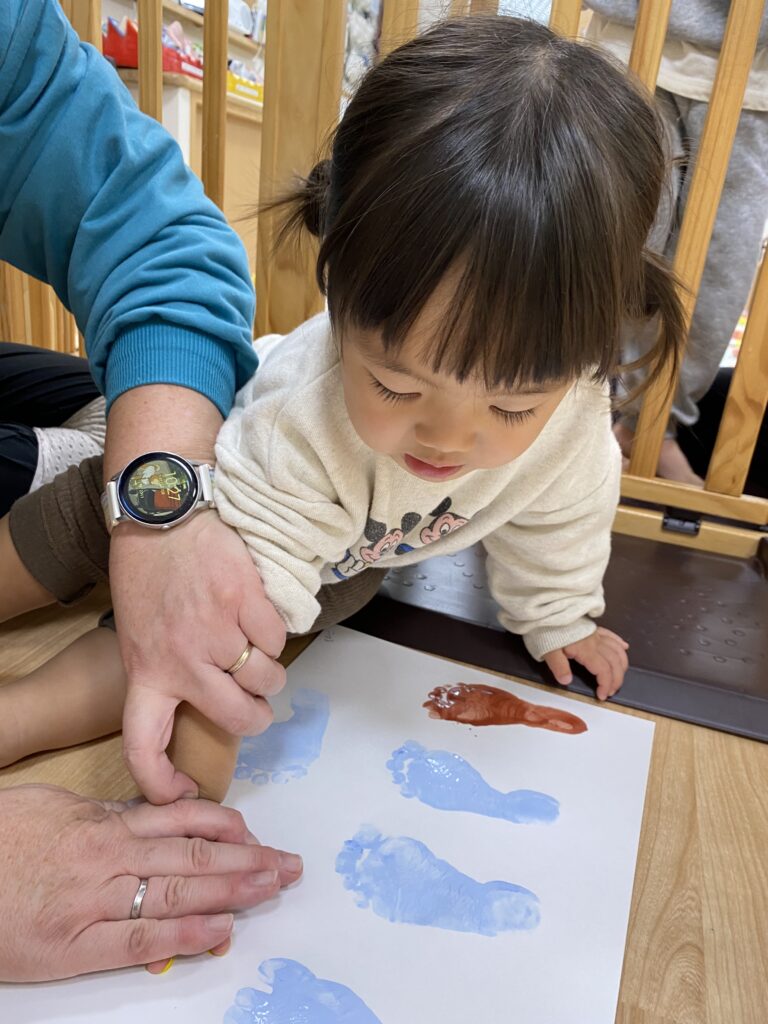 この日は子ども達のかわいい手と足を絵の具を使って型取りしました♪