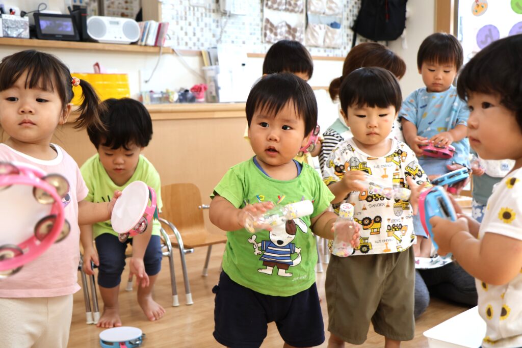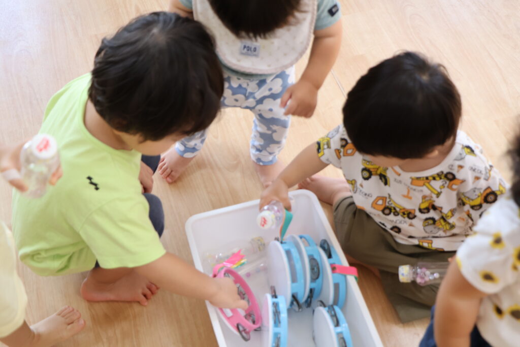 お歌に合わせて、みんなもいろんな楽器を使って遊んでみよう!!ってことで、みんなもどれにしようか考え中・・・。