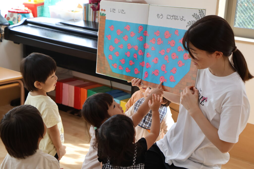 これは【 きんぎょが にげた 】というお話です。みんなできんぎょを探してますよ。